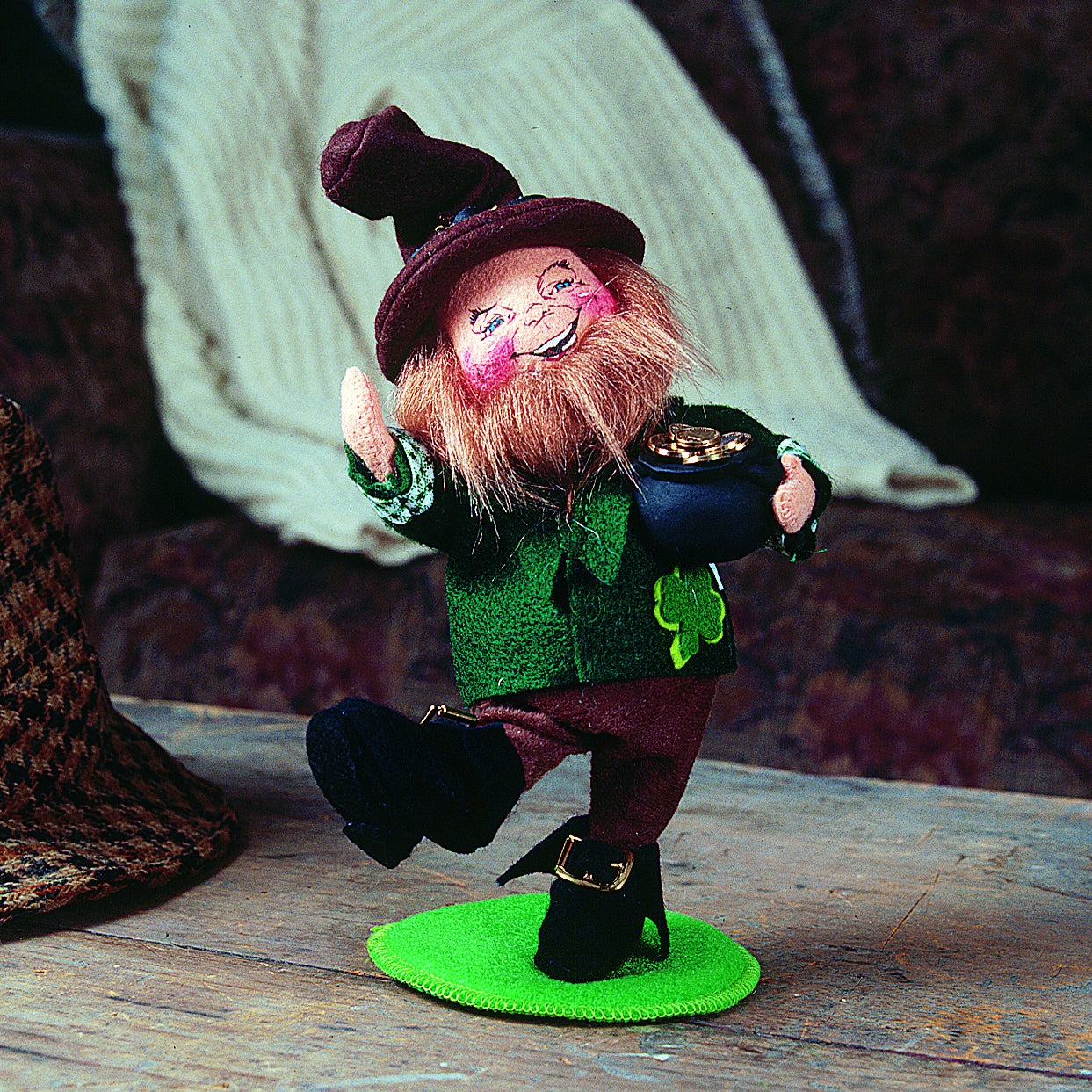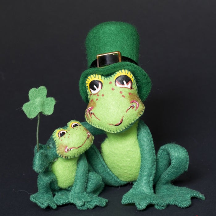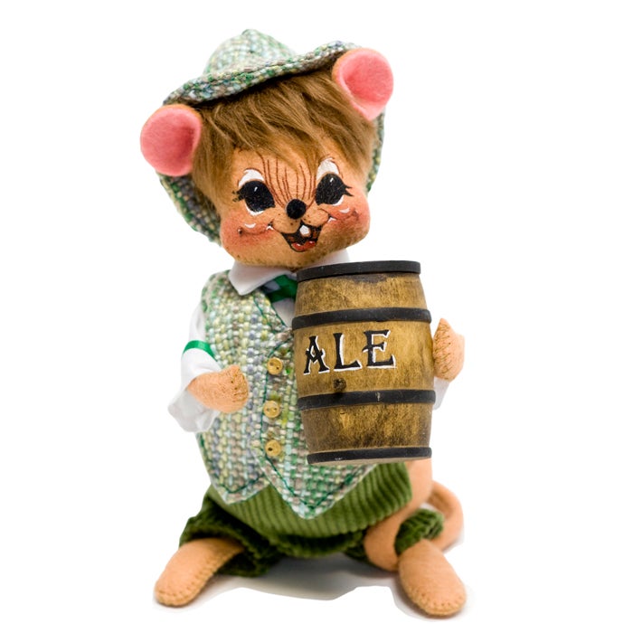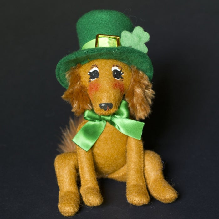 The Irish collection grew to three styles in 1997 and four by 1999. What was once a leprechauns only line was expanded to include mice, kitties, people-type figures and other animals such as frogs, donkeys and dogs! The designs ran the gamut of all things Irish. From kelly green felt, tweed and cable-knit fabrics to accessories like gold coins, shamrocks, horseshoes, pots of gold and steins of beer- they did it all! There have been whistle and drum playing pixies, jolly gentlemen, drunks and dancers. Let’s not forget the Dublin Donkey and the Irish Setter, made as animals started becoming more and more popular among collectors.