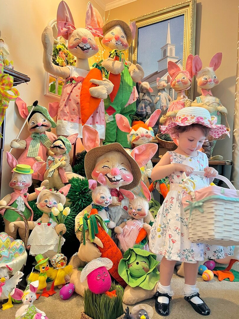 Take a gander at these amazing displays from Jeffrey L. and his daughter Grace (a third generation collector). What an amazing collection featuring a six-foot Easter tree, some rare 1982 Country Girl and Boy bunnies, and even an enlarged photo from the 1981 Annalee Spring/ Summer Catalog. Thanks so much for sharing your impressive collection with us. Congratulations Jeffrey!