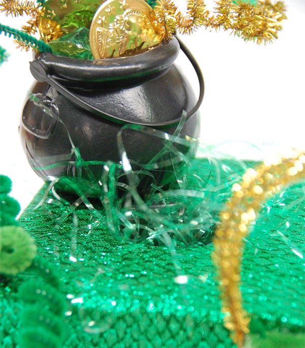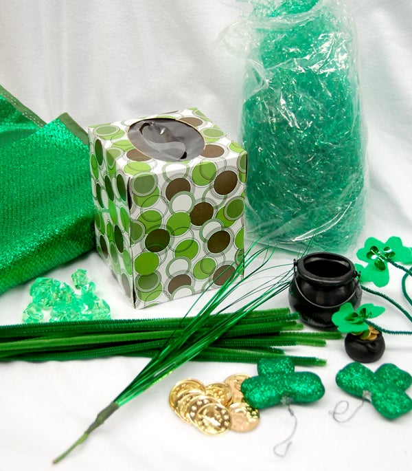 THINK GREEN- both for color and for items’ reusability qualities! Choose a container that will be used as the primary trapping device and then some other things to decorate it with. We’ve used some simple doodads like pipe cleaners, shiny fabric, green cello (like the grass inside an Easter basket) and gold coins to use as bait!