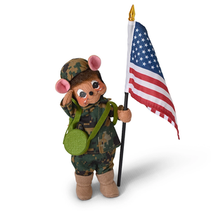 To commemorate all soldiers, both past and present, the elves have designed a new 8-inch Soldier Mouse. He stands tall and proud, holding an American flag, and wears camouflage fatigues and helmet and tan felt boots. His accessories include a canteen and a backpack, both made of felt.