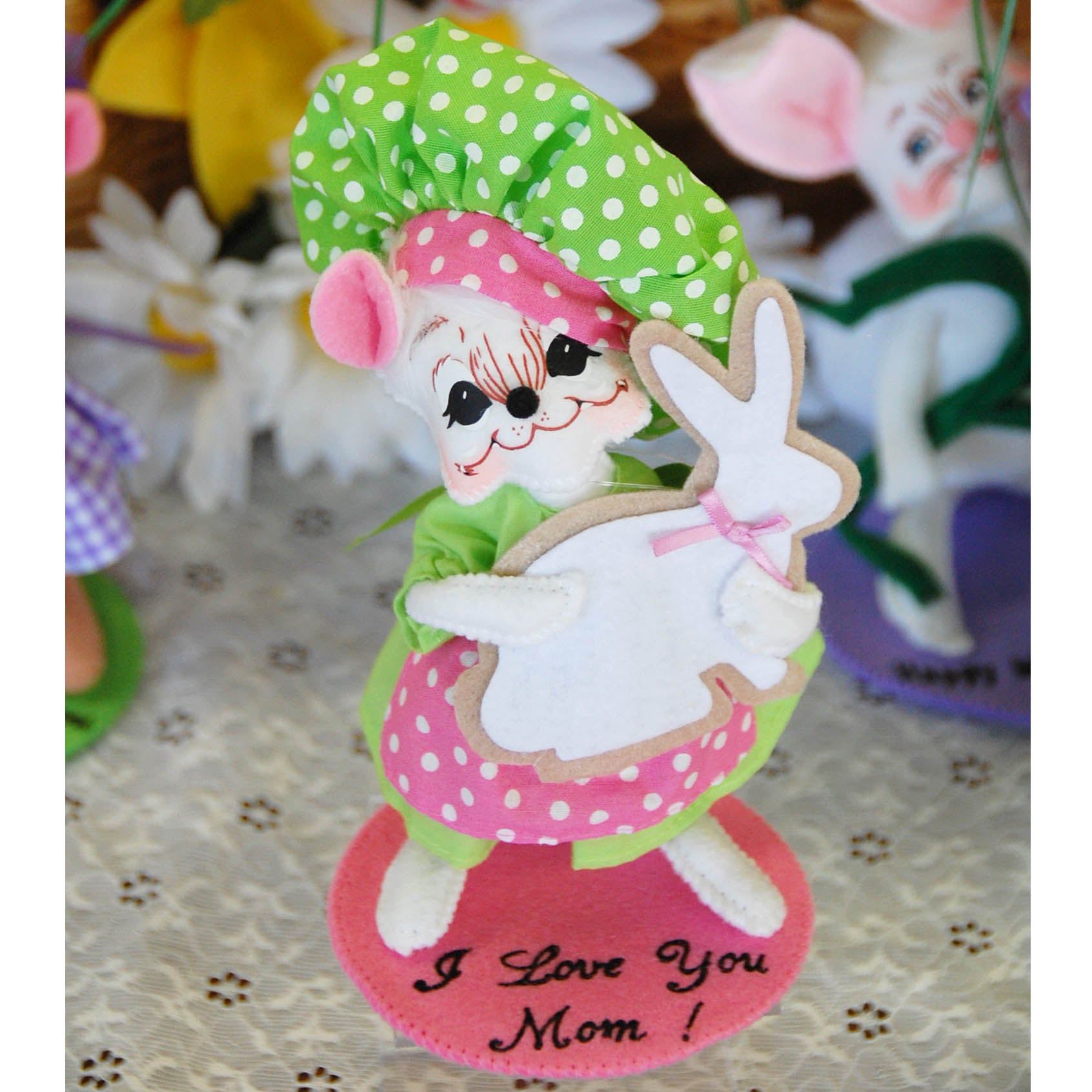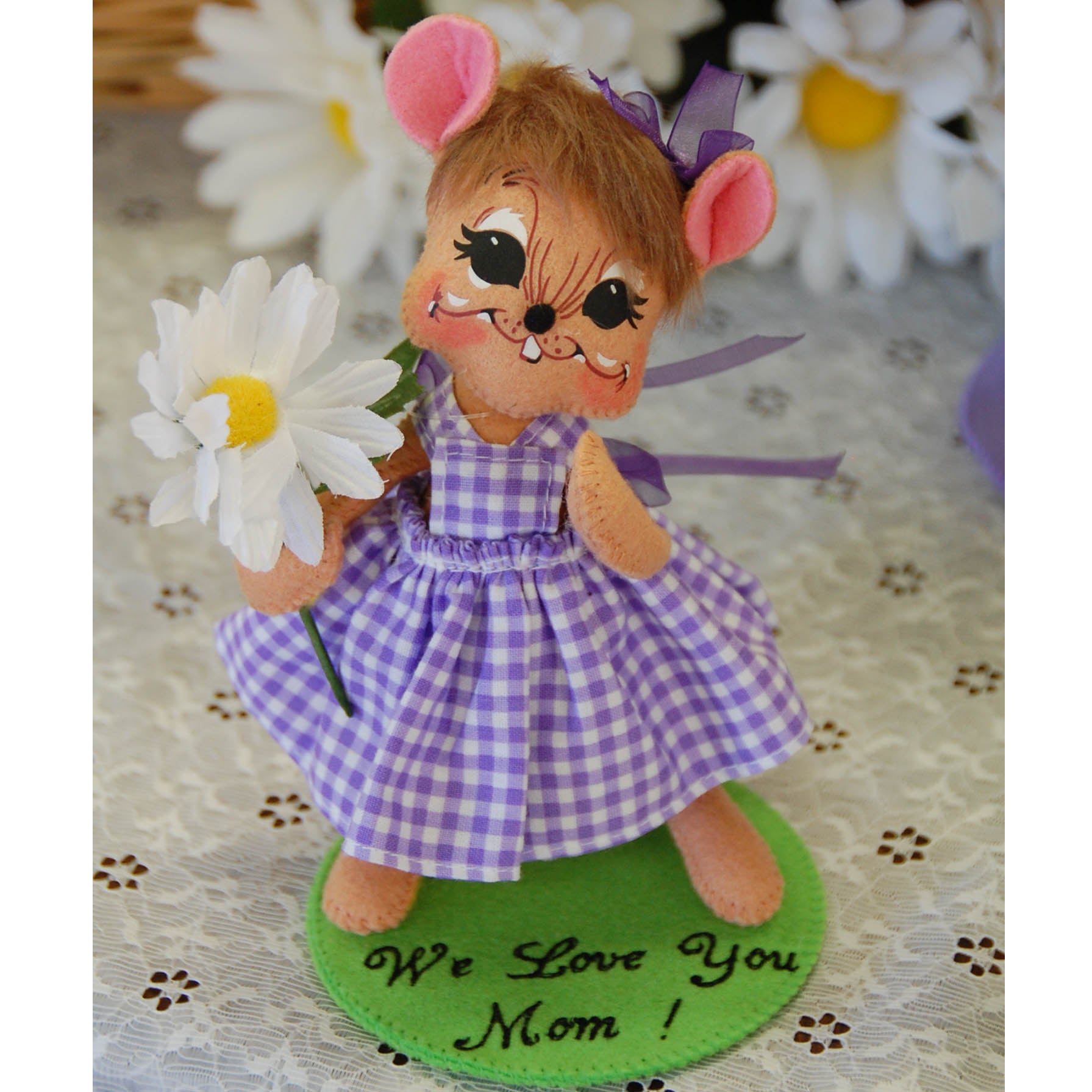 Personalizing your doll is easy! Choose the doll and then select the color felt for the base and add your own message. We offer 9 different coordinating felt-colored bases. You can include up to 2 lines of text with a maximum of 33 characters (Line 1: 18 character maximum | Line 2: 15 character maximum). Commemorate a special occasion and have the date or any message added to the doll’s base. Say “We Love You Mom” in style this Mother’s Day! If you are in the shop this service usually take about 30 minutes and you can watch the designer make the base or come back later and pick it up.