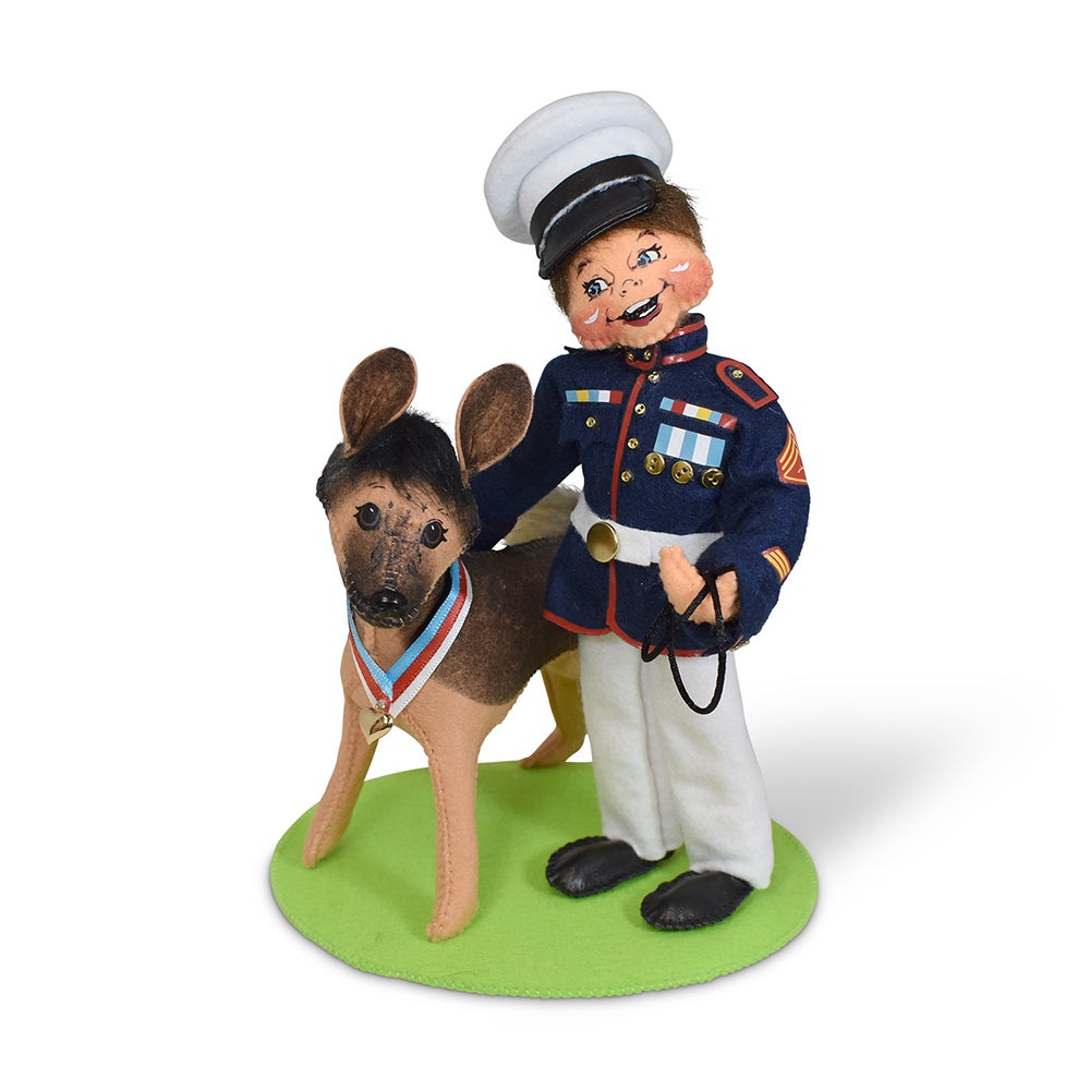 • The service person wears a full dress uniform with medals and badges, intricate trims and buttons. He stands proudly with his German Shepherd service dog that wears a medal of honor around its neck. They are secured to a light green felt base.