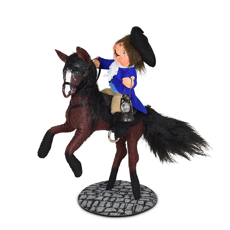 • The famous silversmith gallops over the cobblestone streets on his trusty horse. He wears a black tricorne felt hat, colonial blue coat with light blue waistcoat and white jabot, tan breeches and black shoes. He’s holding a lantern to light his way.