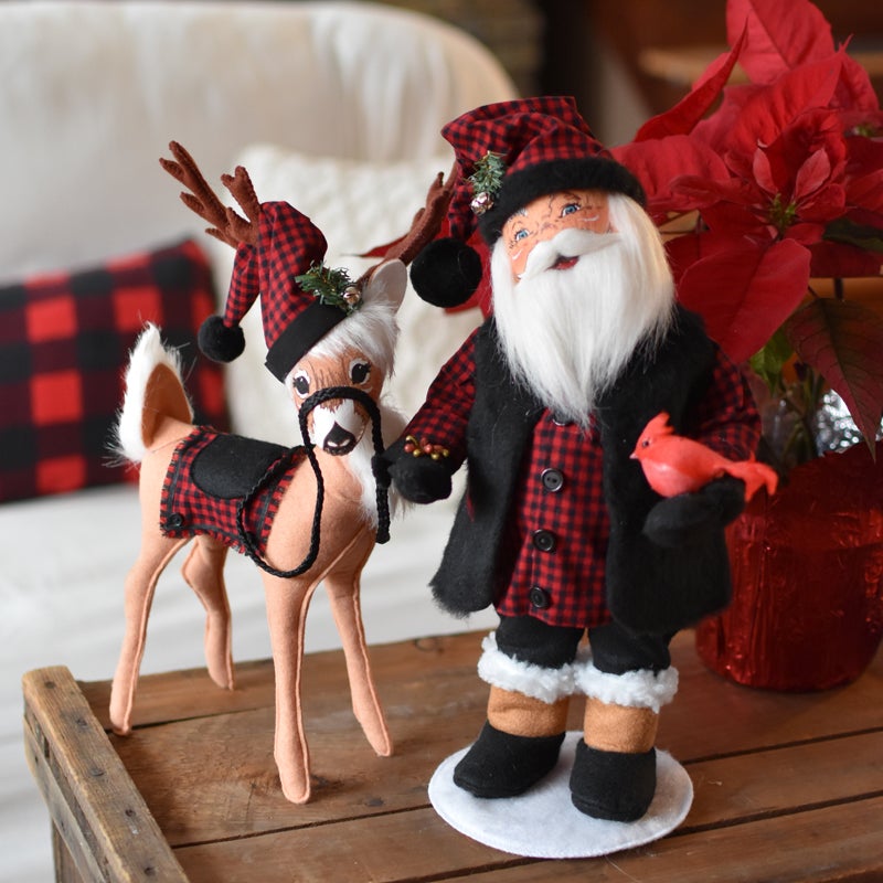 • The 15 inch Santa wears a shirt and hat made with the signature Winter Woods black and red buffalo print, a black fuzzy vest, black felt pants and winter boots!