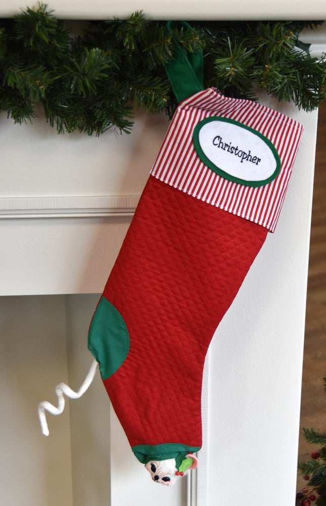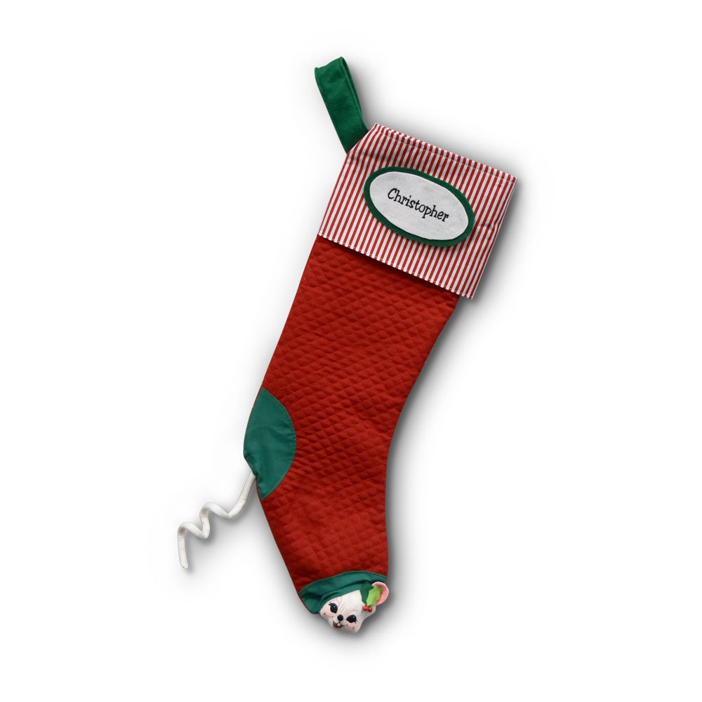 • This traditional Annalee peek-a-boo Christmas stocking features a quilted red fabric with a green heel and toe. A cute white mouse is peeking out through the toe with it’s tail through the heel. The cuff is made of a classic red and white striped cotton. It is a strong stocking and will hold lots of special stuffers!