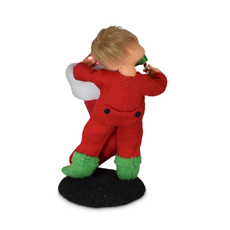• The boy discovers his Christmas stocking full of goodies! He wears cozy red pajamas and green socks.