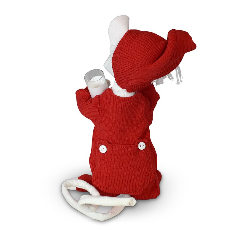 • The 8 inch mouse wears red long john pajamas complete with the bum flap in the back! There are white buttons and patches on the front of the pjs too. He wears a matching stocking cap with a white tassel at the tip and holds a glass of milk.