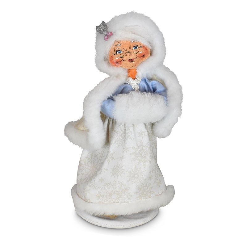 - She wears a hooded cape made of a cream colored linen with white fur trim. The hood has a glittery holly and frosted berries accent. The bodice of her dress is icy blue with a macrame trim detail. The skirt is a soft ivory snowflake print with white fur trim. Her hands are staying cozy inside a white fur muff. She stands on a snowy white base.