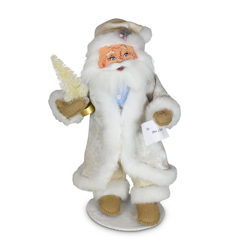 - He wears a long coat made of a soft ivory snowflake print with white fur trim and a coordinating hat with an accent of glittery holly and frosted berries. His shirt is an icy blue with buttons and his pants are a cream colored linen. He wears tan mittens and boots and holds an ivory colored bottlebrush tree in one hand and a Christmas card for Mrs. Santa in the other!