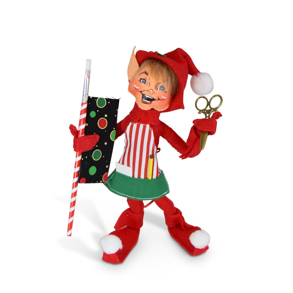 • This 9-inch red elf has his hands full helping Santa prepare for Christmas! He holds a bolt of fabric, a paint brush and a pair of scissors. He wears a red and white striped apron with a green pocket that holds a pencil and paper.
