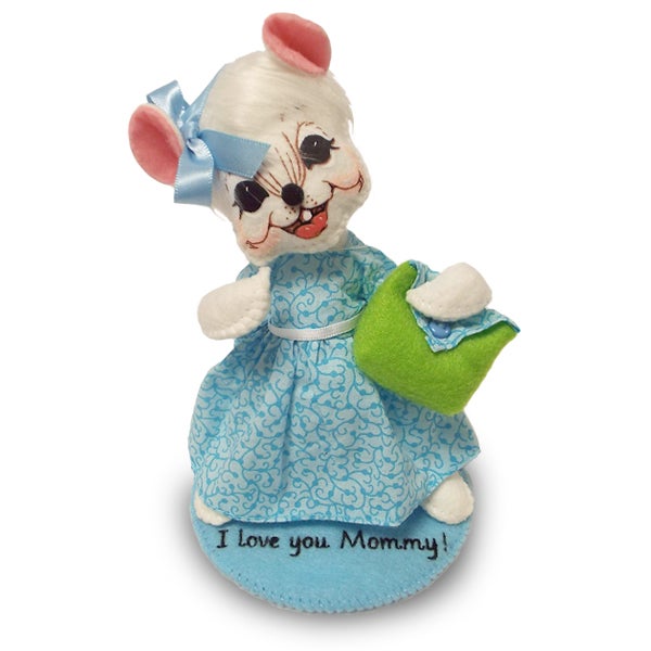 - This 6 inch white mouse looks lovely in her dress done in a delicate blue print with a blue swirl pattern. She has a white ribbon sash and a blue ribbon in her hair. She also has a little clutch done in the same blue fabric with green accent.