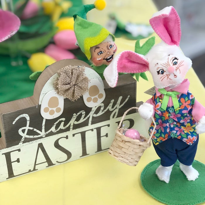 • He is holding a wicker basket with an egg inside amongst the grass. Fun item to use in a tabletop display and looks wonderful when paired with our Easter Girl Bunny!
