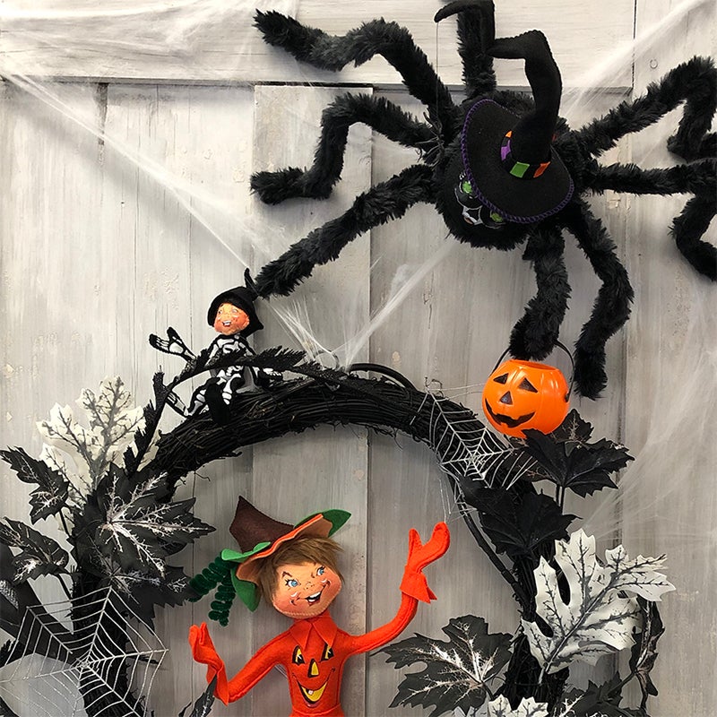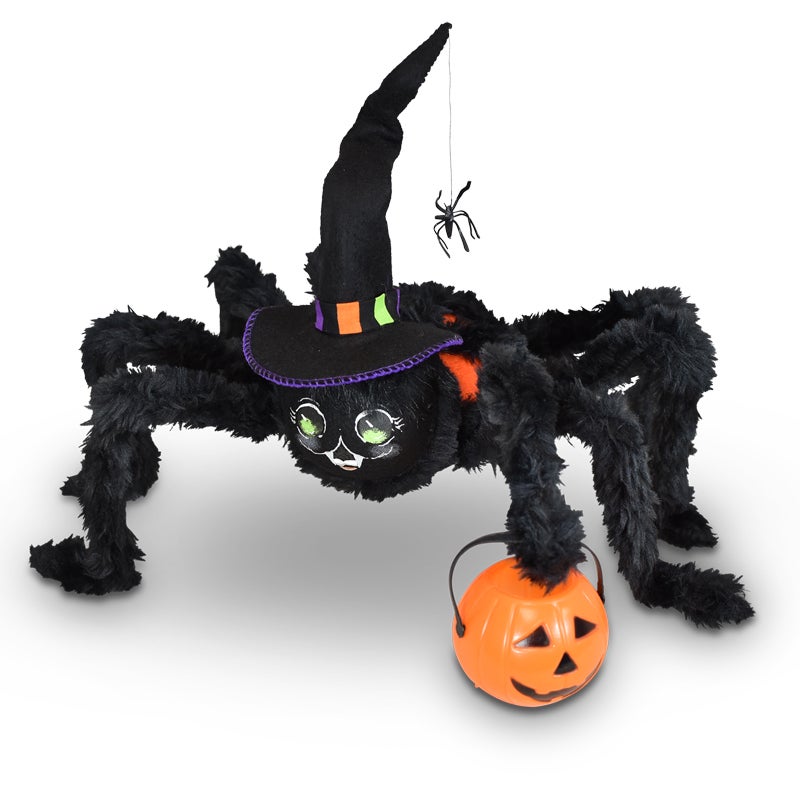 • You will scream with delight when you meet Spooktacular Spider. Eek! The 10 inch fury black spider is off to collect some Halloween treats. This not-so-itsy-bitsy-spider measures 14 inches across and 10 inches high! On its fuzzy black body, there are orange spots made of felt. It wears a black witch hat with purple stitching around the brim and a colorful striped band accent. There’s a small black spider hanging from the tip!