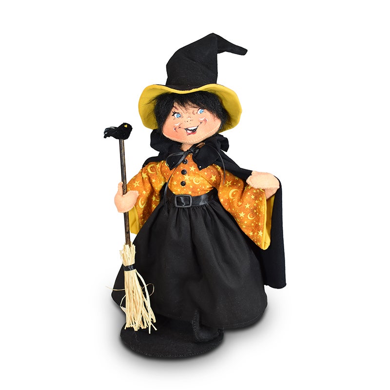 • The top part of her dress is made with the signature Moonlight Halloween fabric, which is gold with a moon and star print. The bottom of the dress, along with her cape, is made with a black cotton material. Her witch hat is made of black felt with a coordinating yellow brim. She holds a broom with a small crow perched at the tip of the stick.