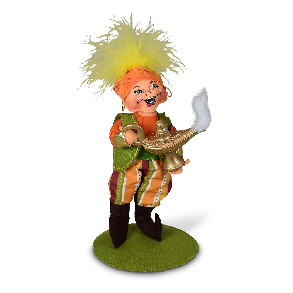 • The seven inch character holds a gold colored lamp with embossed designed and the essence of smoke coming out of the spout. His outfit features an orange shirt and a moss colored vest with gold trim. His pants are a colorful striped pattern with a satin band around the waist. He wears brown felt boots with curled tips and an intricate headpiece with a plume of yellow boa at the top! Gold earrings complete his look!