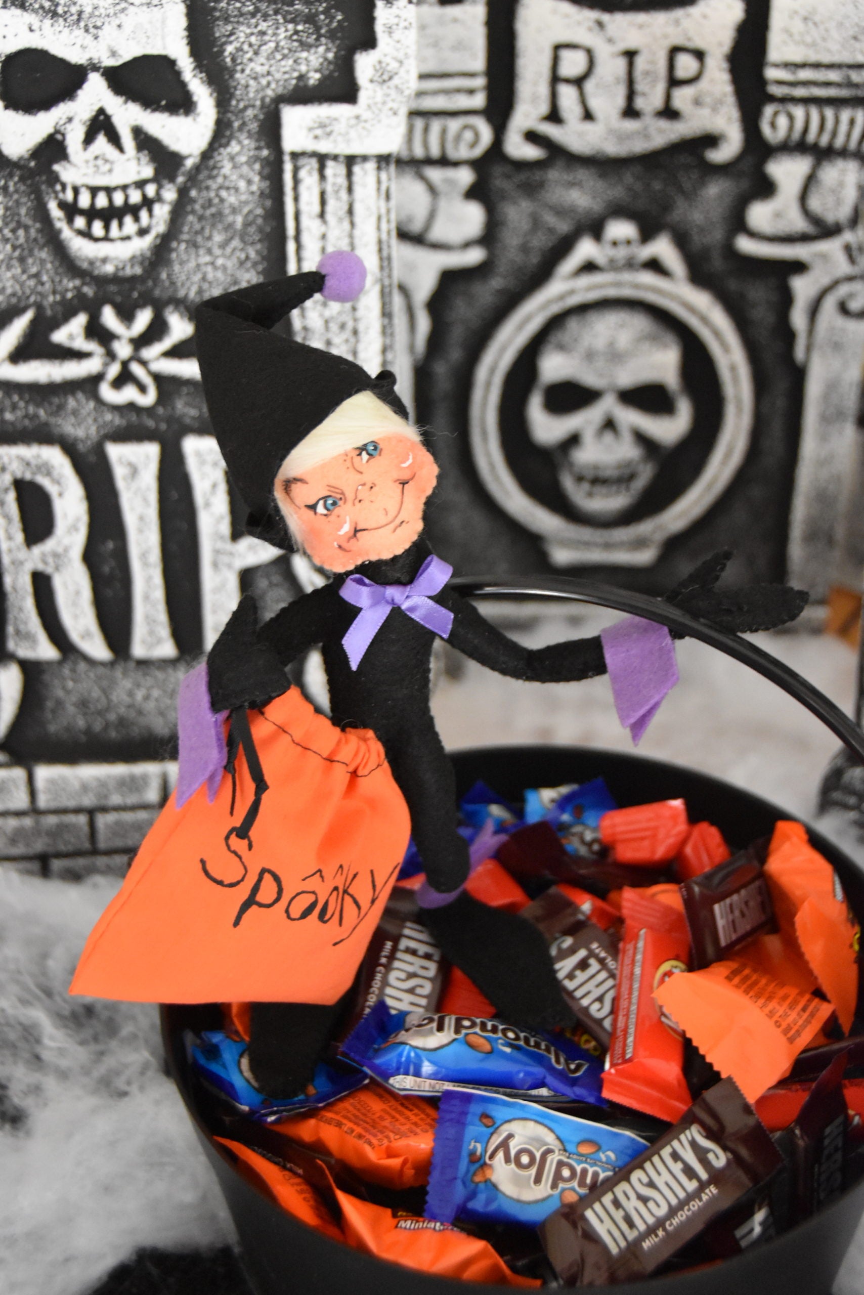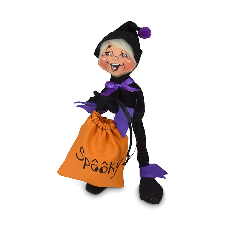 • Our 9 inch black elf has wrist and ankle cuffs done in purple; his bowtie too. A purple pompom is at the end of his upturned black elves hat. He is holding an orange sack that has “Spooky” printed in black on it. Is it full of Tricks or Treats?!?