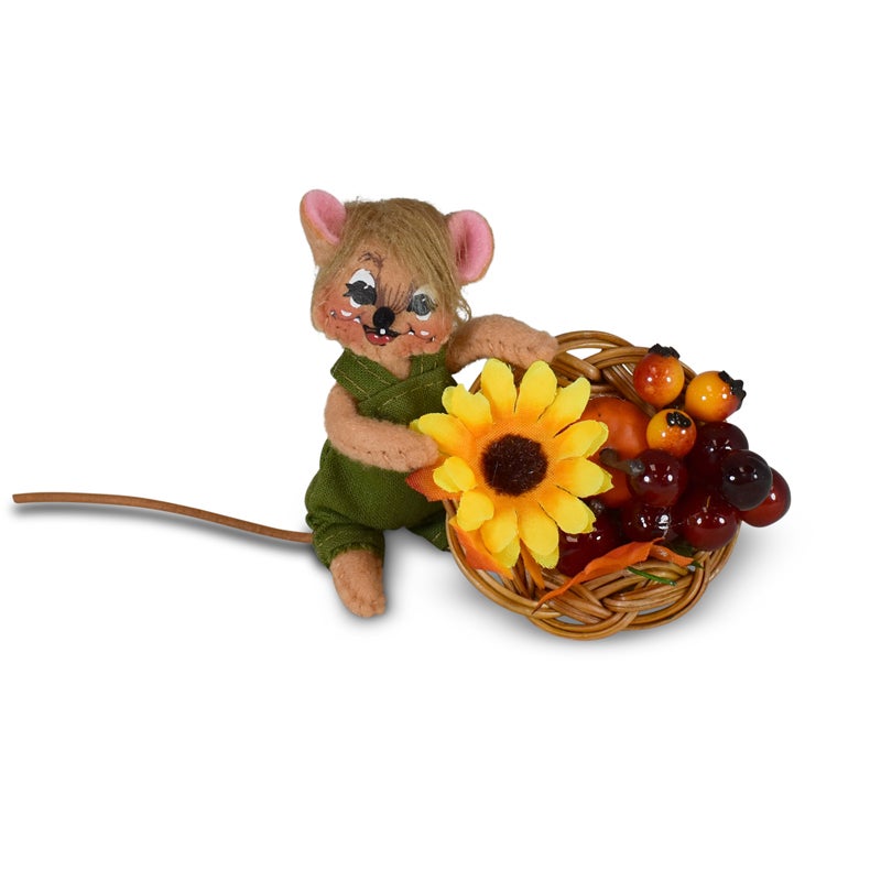 • Our 3 inch amber mouse looks adorable amongst this “horn of plenty” aka cornucopia. Its dark toned outfit lends the perfect blend of color for the fall season. The cornucopia is filled with flowers, fruits and vegetables.