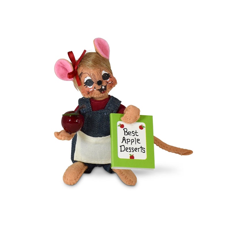 • Our 5 inch amber mouse looks so adorable in its denim overalls and red shirt. She is wearing a little white linen apron and holding an apple in one hand; a cookbook titled “Best Apple Desserts” in the other.