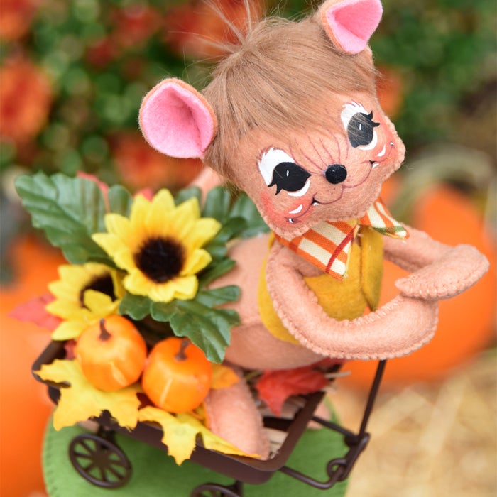 • This 6 inch amber mouse is wearing a gold colored vest trimmed with a harvest colored checkered printed fabric at the collar. It is sitting in a brown wagon that is attached to a green base. He is transporting some leaves, pumpkins and flowers.