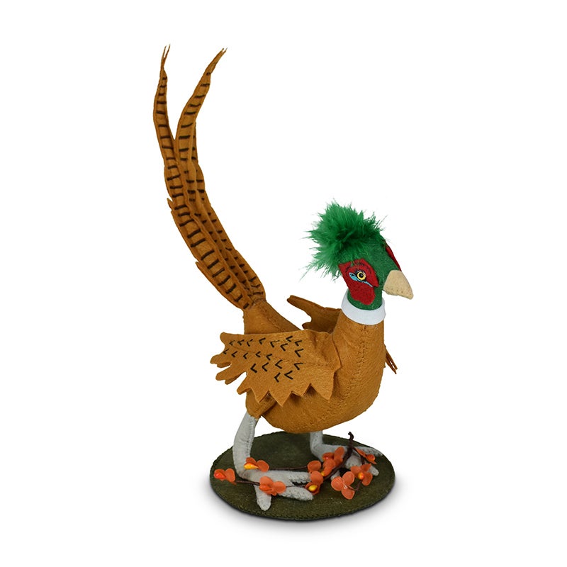 • Our 6 inch ring-necked pheasant is a unique addition to our line this year. The body is done in a rich brownish- red colored felt. The long tail feathers and wings have black markings on them and it has a green head with a tuft of green hair. The eyes are accented in another darker color and it has a light tan beak; there is a white band around its neck. This sturdy gamebird has gray feet and is standing on a dark green base with a sprig of flowering bush.