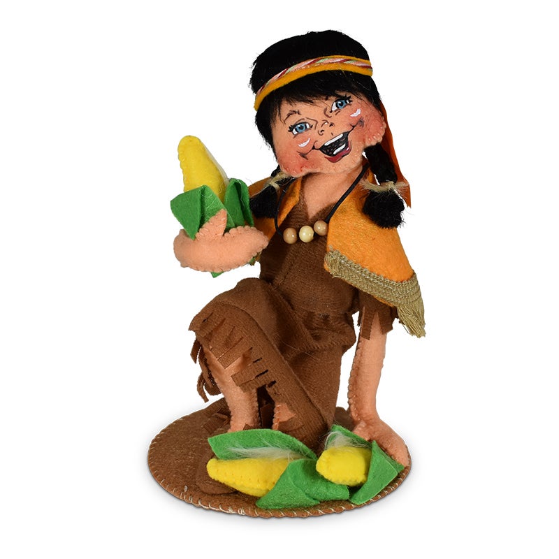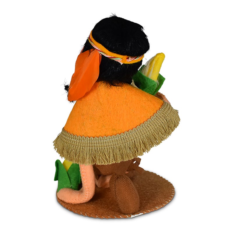 - She wears a traditional Native American outfit with a buckskin-like dress with fringe, a necklace with beads, and a headdress with one feather pointing down. She also wears a shawl with fringe trim. The corn is made of felt with the silk made of faux fur.