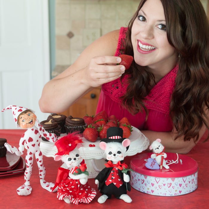 • This 6 inch white mouse is wearing a black suit as well as a red vest with printed white hearts on it with black button accents. He is also wearing a red bow tie.