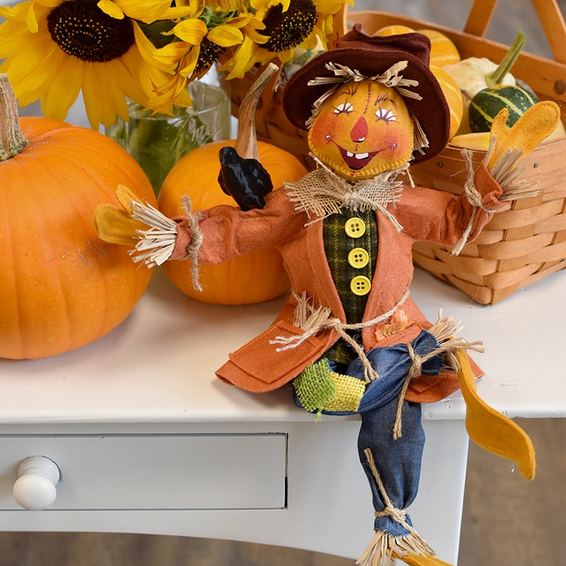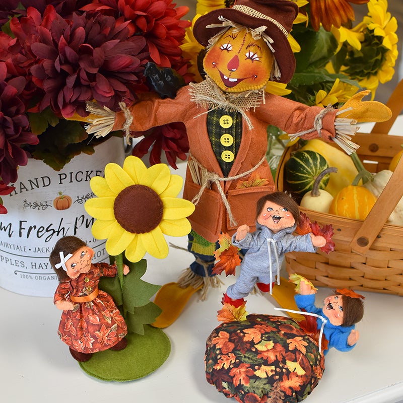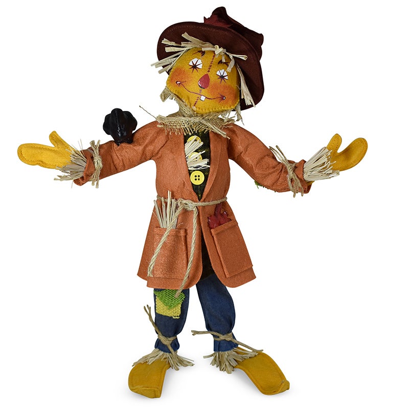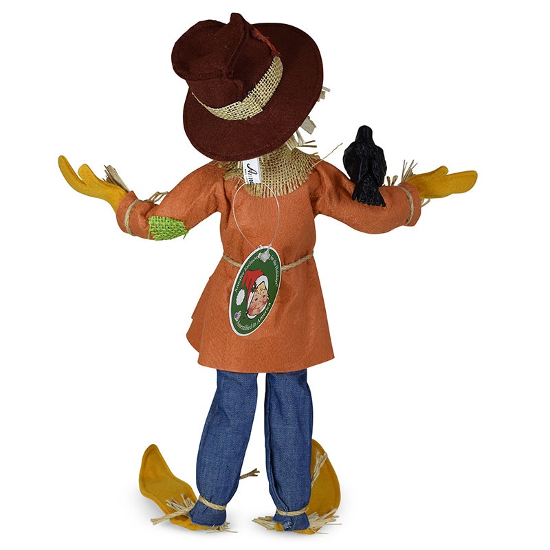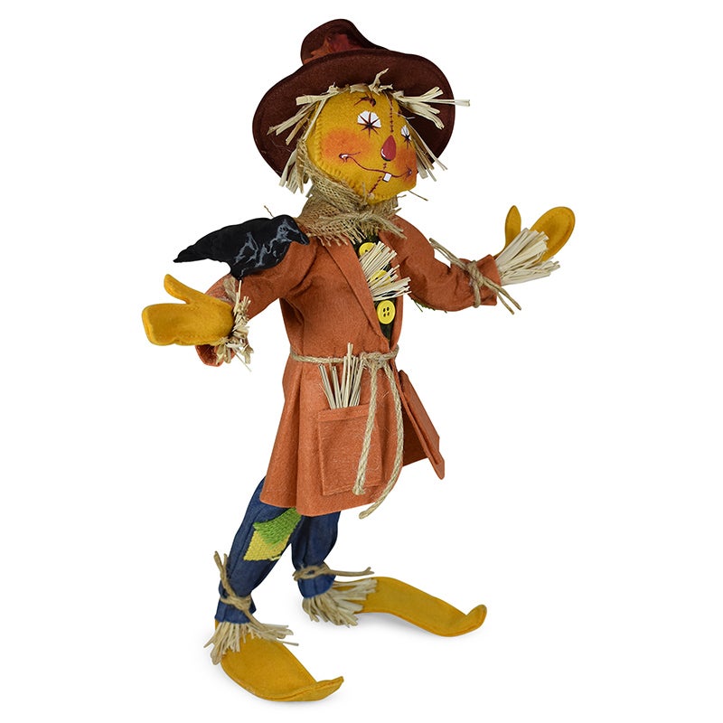 - Standing at a solid fourteen inches tall, the whimsical “Barley” will welcome your guests with a smile this fall. We’ve brought back a vintage scarecrow face that Annalee absolutely loved! Barley has a golden yellow body and wears a mismatched outfit perfect for any fine scarecrow! His coat is made of a burnt orange felt with a flannel check shirt underneath. His denim jeans have burlap patches. A crow sits on one of his outstretched arms. A floppy felt hat with Autumn leaves completes his look.