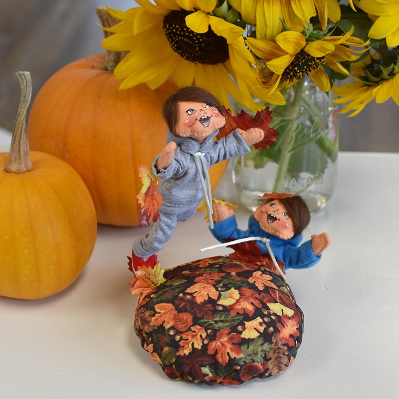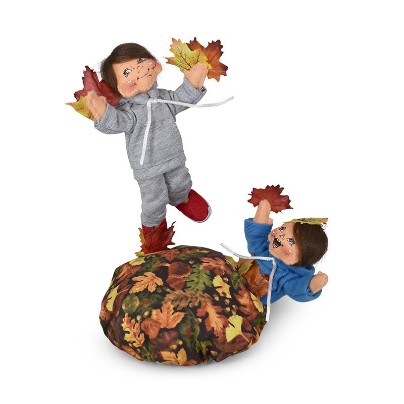 - These two kids are having some Autumn fun jumping in a big pile of colorful leaves! The position on this piece is amazing with one child appearing to be flying through the air about to land on the leaf pile! The other is buried under the leaves! The kids wear sweatsuits perfect for playing outside in the crisp Autumn air!