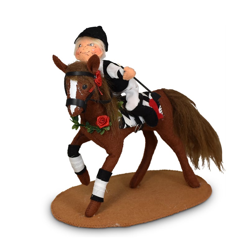 • A 5-inch jockey wears an intricate outfit and holds a crop. He holds on tight to his thoroughbred as they race for the roses. Details on the horse include a bridle, saddle and blanket and leg wraps. The black and white motif is striking. All bets are on #1!