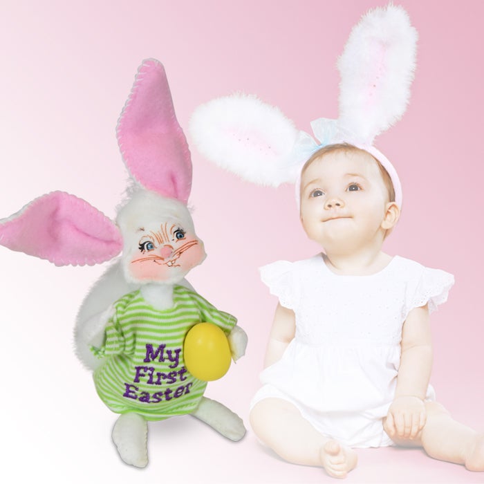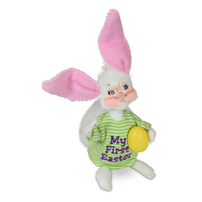 - This 5 inch white bunny is wearing a green and white striped shirt with purple lettering that reads “My First Easter”. This little one is holding a jelly bean too!