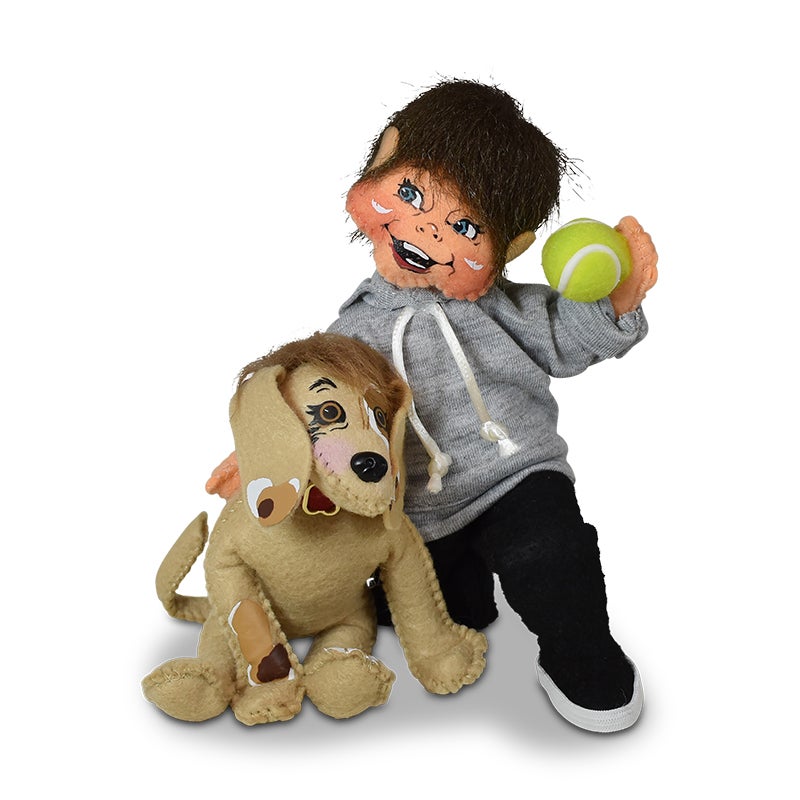 - The 6 inch kid wears a gray hooded sweatshirt, black pants and black shoes. We’ve added ears to the boy as a nod to Annalee’s early people designs! He holds a tennis ball in one hand and has his other arm around his puppy pal. The tan colored dog has multi-colored spots and a tuft of brown hair. He also wears a cute red collar with a gold buckle detail.