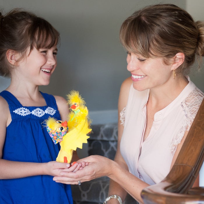 - Our 6 inch yellow duck is holding up a 3 inch yellow ducky in her outstretched wings; the pair is standing on a green base. The little one has on a green satin ribbon bow tie and looks really cute with its tufted hair on its head and backside.