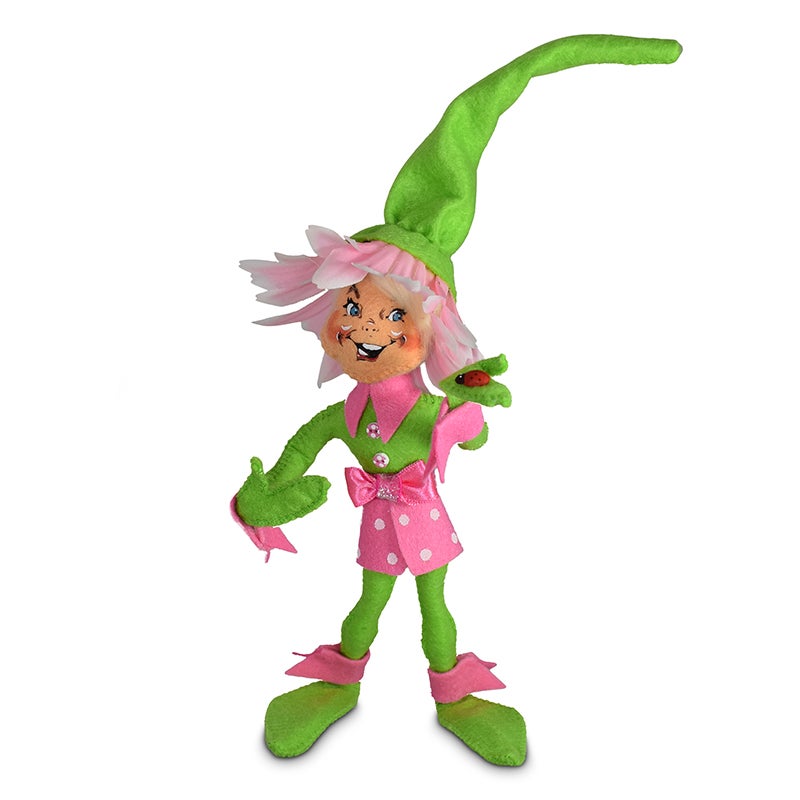 • She has blonde hair and wears a pink polka dot felt skirt and pink cuffs. The brim of her elf hat is made of pink silk flower petals! She holds a little lady bug in one hand.